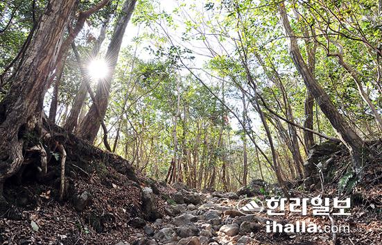 ▲제주도산악연맹과 한라일보가 지난 2009년 한라산 둘레길 '환상숲길' 탐사를 실시, 1100도로변 서귀포휴양림에서 어점이악~효돈천 남성대 제1대피소~수악계곡~5·16도로변까지 20km를 연속해 이어진 동백림 벨트를 확인했다. /사진=강경민기자