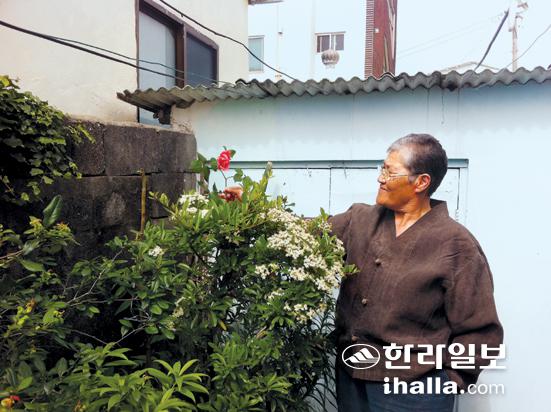 ▲외모와 달리 안개꽃처럼 부드러운 여자인데 사람들이 몰라준다는 이유순씨가 집 마당에서 모두 지고 홀로 남은 장미꽃 한송이를 보며 시상에 잠겨 있다. /사진=표성준기자