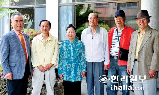 ▲13일 오전 제주시 연동 삼무공원 옆에 있는 대한노인회연동분회 입구에서 홍성표(사진 맨왼쪽) 대한노인회 연동노인회장이 지역봉사에 앞서 동료 회원들과 함께 잠시 포즈를 취하고 있다. /사진 이승철기자