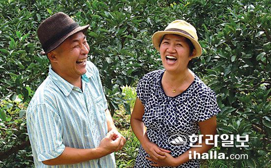 ▲귀농 부부인 이인호·김연화씨가 서귀포시 안덕면 감산리 감귤원에서 활짝 웃고 있다. /사진=이현숙기자
