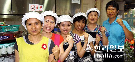 ▲다문화 음식점 '어우렁 다우렁' 주인공들이 포즈를 취하고 있다. 사진 왼쪽으로부터 제니퍼(28·필리핀), 티엔(30·베트남), 검로안(25·베트남), 로즈마리(39·필리핀), 이용옥(56·중국), 김세철 소장. /사진=김명선기자