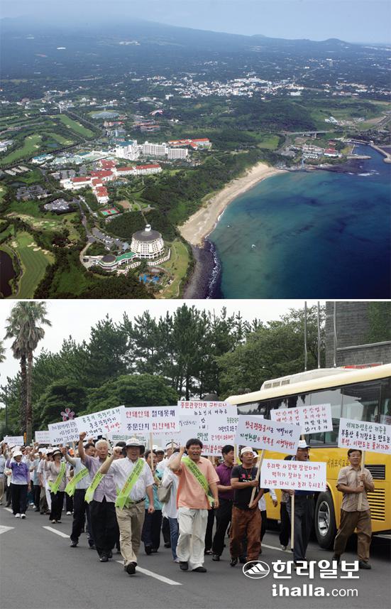 ▲중문관광단지는 한국관광공사가 1982년부터 개발에 착수, 아직도 개발사업이 진행중이다. 정부는 개발이 끝나지도 않은 중문단지에 대해 지난 2008년 공기업 선진화 조치의 하나로 매각 방침을 선언, 도민들의 분노를 사고 있다. 오른쪽 사진은 지난 10일 열렸던 매각반대 집회 장면./사진=한라일보DB