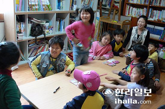 빛과소금아동센터에서 NIE 강의를 진행한 오경순·김영순씨는 수업시작에 앞서 아이들과 친해지기 위해 손 유희와 동화구연을 통해 다가갔다.