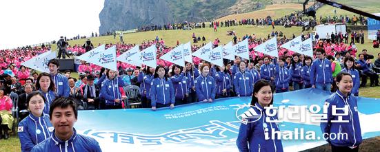 ▲제주섬이 세계7대 자연경관에 선정될 수 있도록 도내 민간단체가 투표활동에 동참하자는 캠페인을 이어가면서 열기가 더해지고 있다. 지난 4월 성산일출봉에서 열린 D-200일 행사 모습. /사진=한라일보 DB