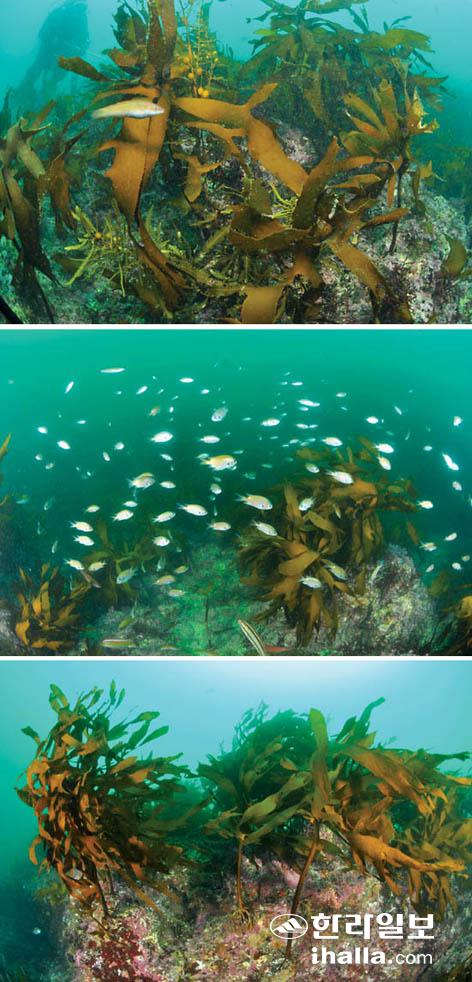 ▲하천리 마을어장은 전 수심대에 걸쳐 감태가 군락을 이뤄 생육하는 등 전반적으로 매우 양호한 해조류 분포를 보이고 있다. 사진 위부터 수심 5m, 10m, 15m의 수중생태계 모습. /사진= 강경민기자