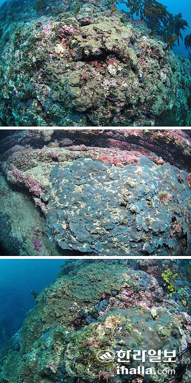 지난 9월 중순 이곳을 찾은 해양탐사대는 서귀포칼호텔과 제주대학교 연수원 사이에서 탐사를 진행했다. 탐사내내 이곳 마을어장에서는 해조류와 소라 등 수산 생물들은 찾아보기 힘들었으나 해양생태 교란생물인 빛단풍돌산호(Montipora trabeculata Bernard), 거품돌산호(Alveopora japonica Eguchi), 그물코돌산호(Psammocora profundacella)가 암반의 표면을 70% 정도 점령하고 있었다.