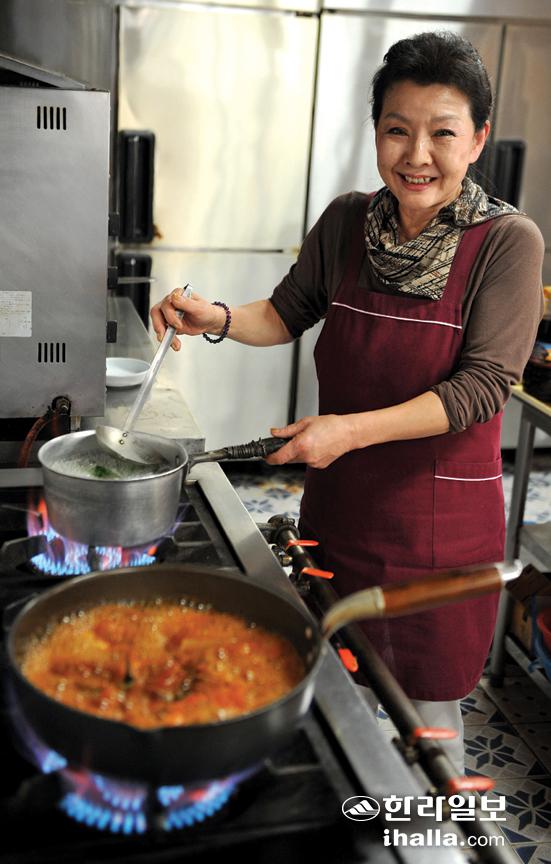 ▲어미도 주인 조정삼씨가 손님 상에 올릴 음식을 조리하고 있다.