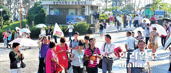 ▲제주를 찾은 관광객이 지난 9일 현재 758만명을 넘어서 지난해 기록한 역대 최고치를 갈아치웠다. 연말까지 50여일 남은 만큼 올해 목표로 한 820만명은 뛰어넘을 전망이다. 사진은 중문대포해안 주상절리대를 찾은 중국인 관광객들. /사진=한라일보 DB