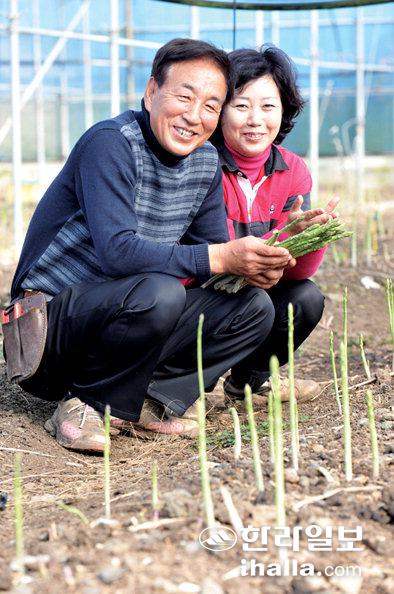 ▲임동진 대표가 부인인 제주 성산출신 정옥수씨와 함께 14일 함덕 소재 자신의 농장에서 아스파라거스를 정성스럽게 수확하고 있다. 이들 부부는 2004년부터 사진영농일기를 쓰며 부농의 꿈을 키워가고 있다. /사진=강희만기자 hmkang@ihalla.com
