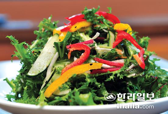 오리음식에 곁들여 나오는 샐러드는 손님들 사이에선 인기가 그만이다. 독특한 샐러드 소스의 비결을 묻자 "비밀"이라는 김씨는 치커리, 상추, 오이, 양파, 파프리카 등 갖은 야채에 과일즙과 식초를 넣어 만든다는 정도만 얘기해 준다. 달콤새콤한 소스가 일품인샐러드를 요리구이와 함께 먹으면 과일과 야채의 상큼함이 고기의 느끼함을 확 없애주면서 입안을 즐겁게 한다.