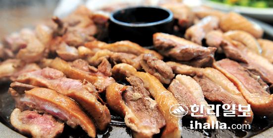 ▲오리고기는 불포화지방산이 풍부해 동맥경화와 고혈압 등 성인병 예방에 효과가 탁월하다. 오리천국에서는 이런 오리고기에 7가지 한약재와 다섯가지 과일로 만든 소스에 숙성 시킨 뒤 참숯불에 구워 손님에게 내놓는다. /사진=이승철기자