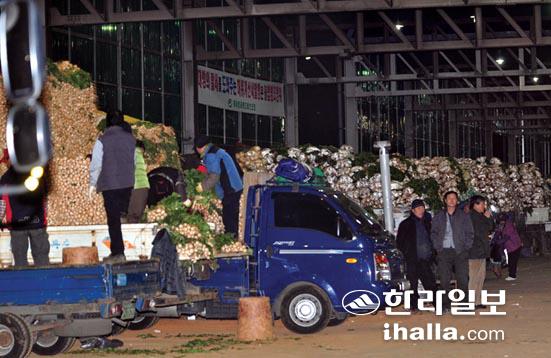 ▲지난 25일 새벽 서울가락시장에는 충청도와 전라도에서 생산된 무를 가득 실은 트럭들이 경매를 기다리고 있다. /사진=문미숙기자