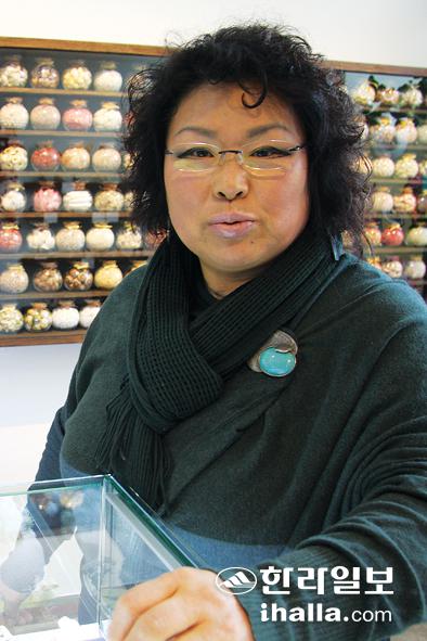 ▲생명을 다한 조개껍데기에 생명을 불어넣고 있는 명연숙 세계조가비박물관장이 자신의 작품에 대해 설명하고 있다. /사진=표성준 기자 sjpyo@ihalla.com