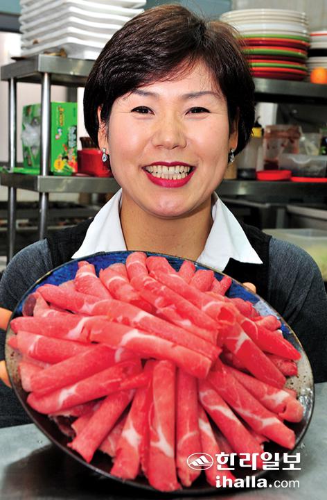 ▲후년하우스 정윤정 대표가 샤브샤브용 말고기를 내보이며 활짝 웃고 있다.