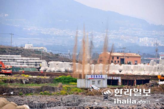 해군측은 구럼비 일대를 육상 케이슨 제작장 등으로 활용하려고 해안 바위를 폭파하고 있다.