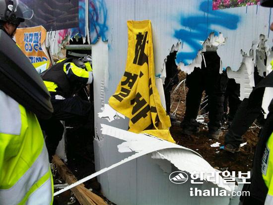 해군이 구럼비 발파를 강행한지 사흘째인 9일. 강정천 입구에서부터 화약이동을 저지하고 있는 강정마을 주민들과 평화 활동가들이 구럼비 발파를 직접 막기위해 이날 오전 10시쯤 사업장 안으로 들어갔다.