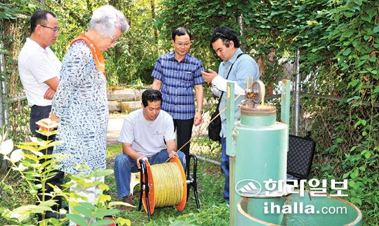 ▲도민의 생명수인 지하수. 제주자치도는 지하수위를 모니터링하고 있는데 지하수 관리 및 보호를 위한 효과적인 모니터링 네트워크의 설계 등에 기초 자료로 활용되고 있다. 위 사진은 제주의 지하수위 측정모습.