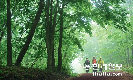 ▲이슬비 머금은 사려니 숲길을 걷고 있는 탐방객들, /사진=한라일보 DB