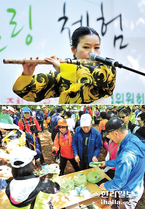 ▲'숲속의 작은 음악회'에서 대금은 신비롭고 아름다운 선율을 선사했으며(사진 위), 개막식 후 주최측은 탐방객들에게 한국의 계절별 자생식물을 담은 손수건과 도종환 시인의 시구가 담긴 부채를 기념품으로 나눠줬다. /사진=강희만기자