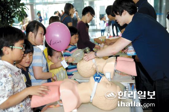 ▲2일 제주학생문화원과 청소년 거리 일대에서 제5회 범도민 안전체험 한마당 행사가 열렸다. 아이들이 심폐소생술 체험을 하고 있다. /사진=강희만기자