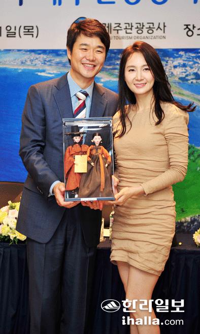 이들 부부는 21일 오후 공사 대회의실에서 홍보대사 위촉장과 함께 기념품으로 '갈옷입은 부부' 인형을 선물받고는 "너무 이쁘다"며 감탄한 뒤 무한한 제주사랑과 아낌없는 애정을 보였다.