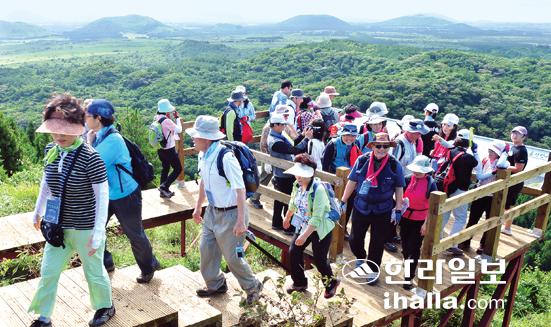 ▲2007년 '제주 화산섬과 용암동굴'의 세계자연유산 등재 이후 5년이 지난 가운데 외국인관광객 등 세계자연유산지구를 찾는 탐방객의 발길이 가파른 상승세를 보이고 있다. 이에 반해 유산지구 내 마을발전 등은 더딘 상황이다. 2008년부터 올해까지 마을발전사업에 지원된 예산은 겨우 7억원에 불과한 실정이다. 사진은 거문오름 정상부를 찾은 탐방객들. /사진=한라일보 DB