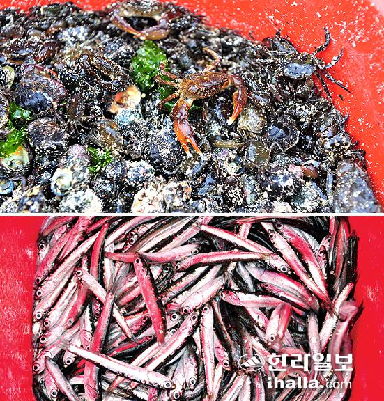 ▲금능리 원담 안에서 잡은 보말, 바닷게(사진 위쪽)와 멜(아래쪽).