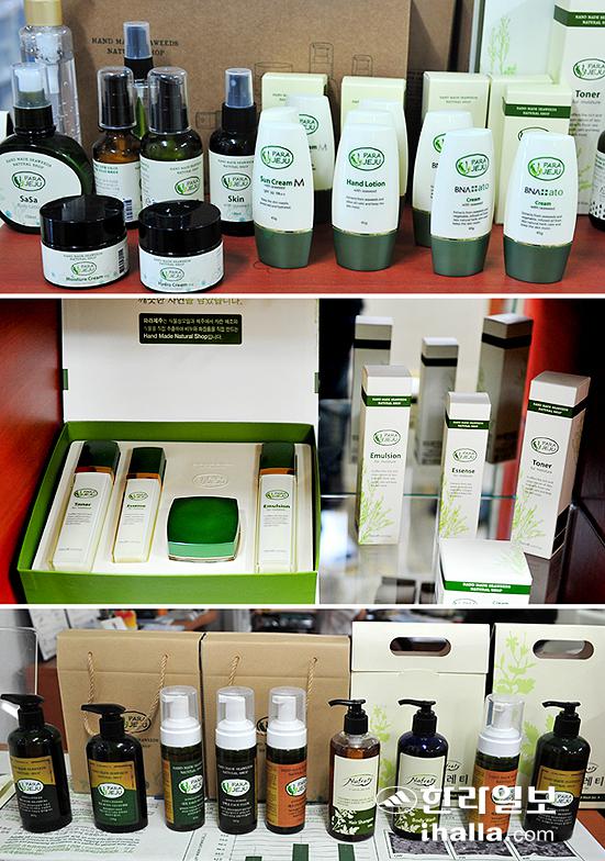 특히 청정제주에서 자란 해조추출물(감태)과 식물추출물(녹차)을 사용하고 인공계면활성제를 넣지 않고 식물성오일과 가성가리를 이용해 만든 해조천연세정용세트는 보습과 피부진정효과가 뛰어난 제품으로 평가를 받고 있다.