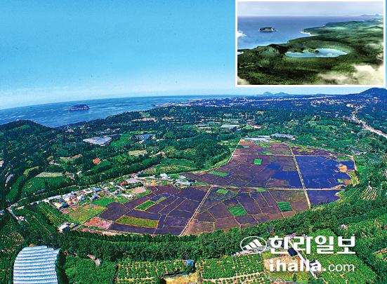 ▲2012 세계자연보전총회(WCC)를 계기로 서귀포시 도심에 자리잡은 하논분화구 복원과 보전을 위한 새 전기가 마련됐다. 사진은 하늘에서 촬영한 하논과 하논 복원시뮬레이션 결과 모습(작은 박스). /사진=한라일보 DB
