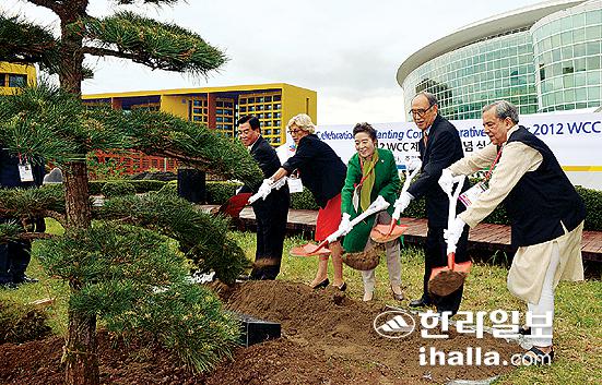 ▲15일 2012 세계자연보전총회 폐회식에 앞서 우근민 도지사, 줄리아 마르통 르페브르 세계자연보전연맹 사무총장, 유영숙 환경부장관, 이홍구 WCC 조직위원장, 아쇽 코슬라 IUCN총재(왼쪽부터)가 제주국제컨벤션센터 인근 무궁화동산에서 해송을 기념식수했다. /사진=강경민기자