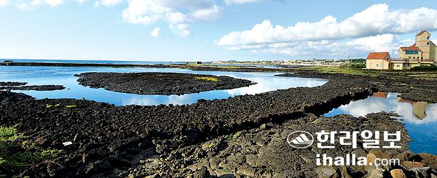 ▶신창리=신창리 조간대는 파호에호에 발레용암에서 특징적인 투물러스가 잘 발달돼 있다. 신창성당 앞에서 시작해 용수포구까지 이어진 총 길이 5km의 해안도로를 따라가다보면 정비가 잘 된, 사방이 돌담으로 둘러쳐 진 노천 용천수(신개물) 목욕탕을 만날 수 있다. 신개물은 바닷가에서 새로 발견한 물이란 뜻이다. 용천량이 풍부하고 많은 사람들이 이곳을 이용하면서 관리도 잘 돼고 있다.