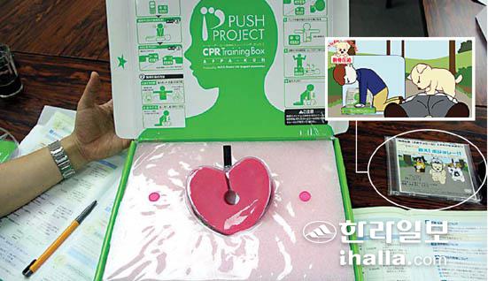 ▲심폐소생술 교육기구인 '압박 군'에 있는 하트모양의 가슴을 강하게 압박하게 되면 소리가 나는데, 소리가 나야 합격이다. 박스 사진은 강아지 캐릭터를 활용한 심폐소생술 교육 DVD 동영상의 한 장면이다. /사진=최태경기자