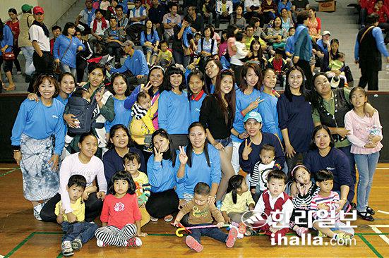 ▲지난 1일 제주대학교 체육관에서 열린 '2012 이주민과 함께하는 한가위 어울림 생활체육축제'에 참여한 '제주도 서귀포시 필리핀 결혼이민자 연합 모임' 회원과 자녀들. /사진=김명선기자 Ngày 1 tây vừa qua tại hội trường thể thao của trường đại học jeju, hình ảnh các thành viên và những đứa con " đội hợp nhóm hội liên hợp phụ nữ kết hôn di trú người philippin ở thành phố seowipo jeju" cùng tham dự lễ hội thể thao và cuộc sống nhân dịp lễ trung thu dành cho những người dân di trú ở jeju năm 2012 ./nhiếp ảnh : nhà báo 김명선
