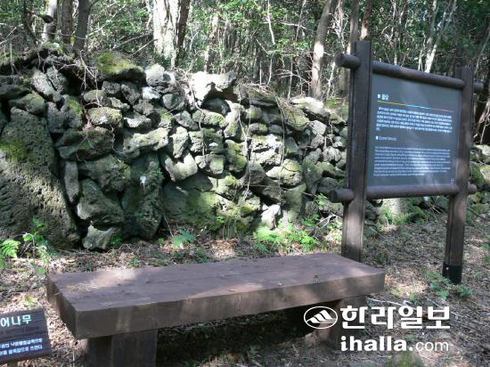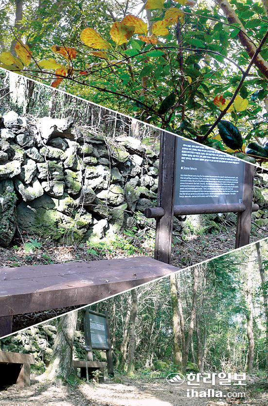 '호근산책로'에는 친환경 야자매트가 깔려 있다. 목재테크보다는 발과 땅이 가까워지는 느낌이다. 숲길에는 제주인들의 지혜가 담긴 돌담길도 있다. 제주의 돌담은 제주의 환경적 열악함을 지혜롭게 극복하는 열쇠였다. 돌 많은 토지에 널려진 돌들을 정돈해 얼기설기 쌓은 제주돌담은 바람에 무너지는 일없이 효과적으로 바람의 세기를 줄여 안전한 주거공간을 조성하고 흙의 유실을 막았다. 산책로를 10여분 남짓 걸으면 돌담길이 나타난다. 돌담 옆으로 쉼터도 간간이 마련됐다. 친절하게 나무 이름표도 세워져 있다. 서어나무, 송악, 꽝꽝나무 등 나무들에게 이름을 나긋하게 부르며 걸으면 혼자가 외롭지 않다.