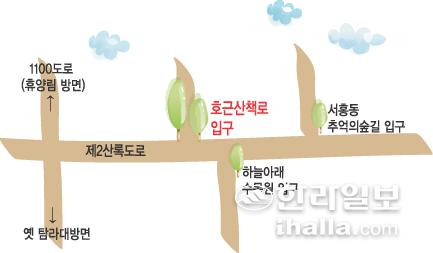 서귀포시 제2산록도로 인근 '호근산책로'에 가면 아늑하고 조용한 마을숲길의 진수를 맛볼 수 있다. 호근마을회(회장 오종석)는 최근 마을 숲과 시오름, 한라산 둘레길을 연결하는 '총각화전터' 4.5km 구간을 조성해 개장했다. 시오름과 한라산 둘레길을 잇는 중간 숲길로 다양하고 아름다운 자연을 살펴볼 수 있다.