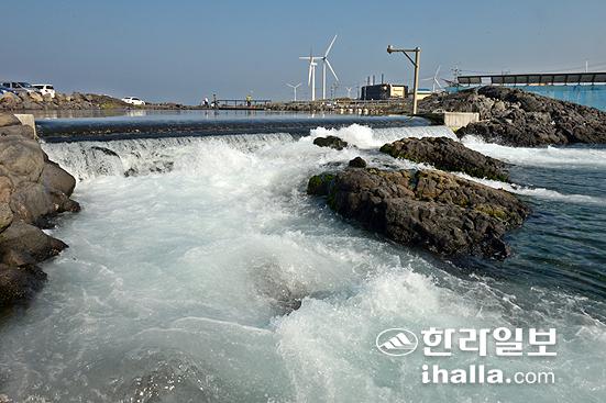 ▲27개 양식장이 밀집해 있는 행원양식단지에서 나오고 있는 배출수가 내를 이뤄 바다로 흐르고 있다.