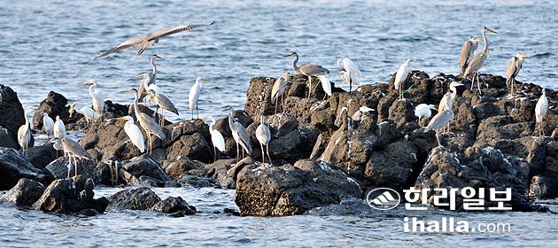 ▲김녕리의 한 육상양식장 앞에 있는 '여'에서 먹이사냥을 준비하고 있는 쇠백로와 왜가리 무리. /사진=강경민기자