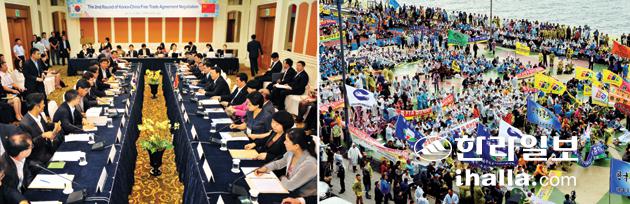 ▲한·미FTA에 이어 한·중FTA 추진으로 제주농업이 위기에 직면했다. 사진 왼쪽부터 지난 7월3일~5일 서귀포시 중문 롯데호텔에서 열린 한·중FTA 2차 협상과 이달 중 열릴 예정인 4차 협상을 앞두고 지난 22일 제주시 탑동광장에서 열린 한·중FTA 협상 반대 대규모 궐기대회. /사진=한라일보 DB