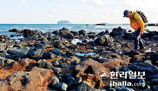▲종달리 남쪽 바닷가에는 파호에호에 용암류가 바다 속까지 길게 분포돼 있고, 용암류의상부를 신양리층이 일부 덮고 있다. /사진=강경민기자