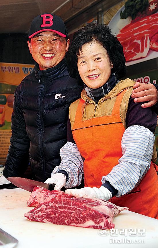 ▲제주서문공설시장 내에서 24년동안 부부식육점을 운영하고 있는 박귀종·엄시옥씨 부부. /사진=이승철기자