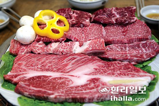 ▲한우 모듬접시에는 등심, 살치살, 갈비가 가득하다 /사진=이현숙기자
