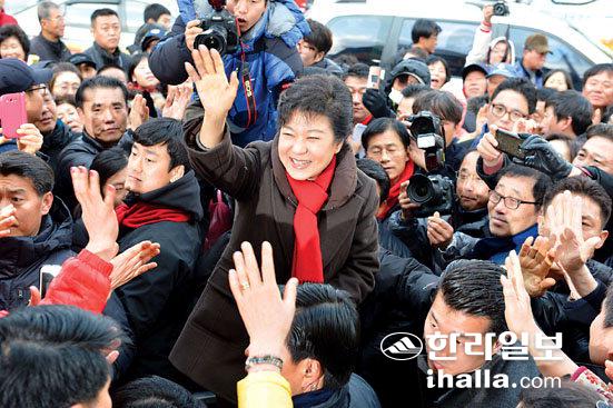 ▲11일 제주를 방문한 새누리당 박근혜 대선 후보는 4·3추념일 제정 등 제주 현안사업에 대한 해결을 약속했다. 박 후보가 제주시 동문시장을 찾아 도민들을 향해 손을 흔들고 있다. 강경민기자 photo6n6@ihalla.com