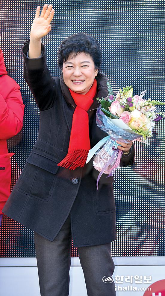 ▲박근혜 새누리당 대통령후보가 11일 서귀포시 1호광장 유세에서 손들어 인사하며 지지를 호소하고 있다. 강희만기자