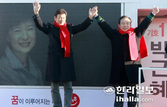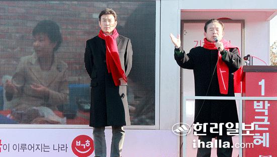새누리당 이인제 공동중앙선대위원장과 탤런트 길용우(왼쪽)가 12일 제주시오일장을 찾아 박근혜 후보의 지지를 호소하고 있다.