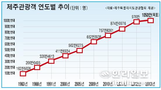 밀레니엄 시대를 연 2000년 400만명을 넘어선 뒤 수년간 소폭의 상승세를 거듭하다 2005년 500만시대를 열었다. 4년후인 2009년 600만, 2010년 700만, 2011년 800만명 시대를 잇따라 열었고 지난해 970만명이 제주를 찾으면서 1000만명, 즉 메가투어리즘 시대를 눈앞에 뒀다. 제주관광시장은 최근 수년간 매년 전년대비 100만명 이상 증가하는 고공행진을 이어가고 있으며 이같은 추세라면 올해 1000만명 시대를 열게 확실시 되고 있다.