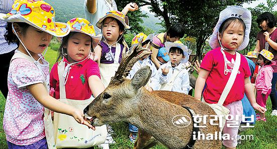 ▲제주시 노루생태관찰원을 찾은 어린이집 원아들이 노루에게 먹이를 주는 모습