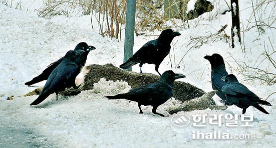 ▲차에 치여 죽은 노루가 까마귀 떼에 둘러싸여 있는 모습.