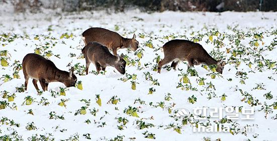 ▲주위를 경계하며 무를 뜯어먹는 노루 무리