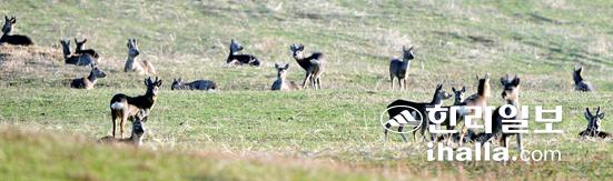 ▲중산간 들녘에서 여유롭게 풀을 뜯는 노루 떼. 사진=한라일보 DB