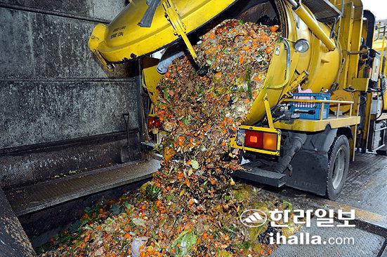 ▲올해부터 음식물쓰레기종량제가 전면 시행됐지만 참여율이 낮아 행정에서는 제도를 이해시키고 참여를 이끌어내느라 한바탕 홍역을 치르고 있다. 제주시 회천동 음식물쓰레기 자원화시설에 쏟아지는 음식물쓰레기. 강경민기자